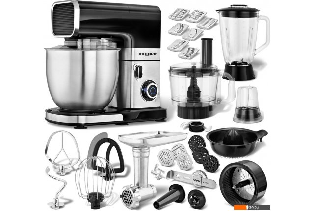 | Полная комплектация | Миксер с 4 насадками (для замешивания теста, для взбивания, для смешивания, для смешивания с гибким краем) Мясорубка с металлическим приводом, 3 дисками (для мелкой, средней и крупной рубки), 6 насадками (для трубчатых макарон, лапши, спагетти, домашней колбасы, кеббе и 4 видов печенья) Соковыжималка для овощей и фруктов центробежного типа Соковыжималка для цитрусовых с сетчатым фильтром Блендер Кофемолка Измельчитель |