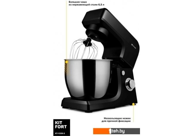 | Информация | Ультрасовременный и мощный стационарный миксер «2 в 1» Kitfort KT-1339 поможет вам смешать ингредиенты, взбить яичный белок или сливки, приготовить картофельное пюре, соус, крем, мусс, замесить жидкое тесто для блинов и крутое для пельменей и пирогов. В комплекте имеется блендер для приготовления соков, супов-пюре, соусов, молочных коктейлей, смешивания фруктовых и фитнес-напитков. |