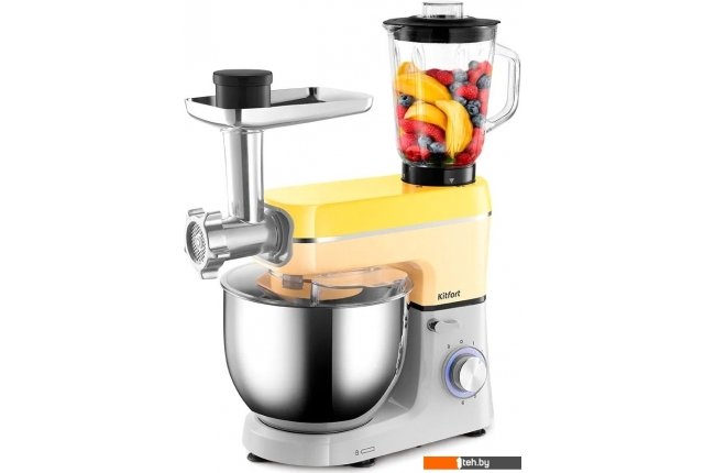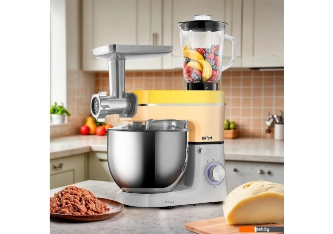 | Информация | Многофункциональный планетарный миксер «3 в 1» КТ-3468 поможет вам смешать ингредиенты, взбить яичный белок или сливки. Также он может перемолоть мясо на фарш и смешать фруктовые и фитнес-напитки, молочные коктейли, соусы и детское питание. Миксер оснащён планетарной системой смешивания: во время работы насадка вращается вокруг своей оси и одновременно движется по окружности по внутреннему объёму чаши, обеспечивая идеальное качество смешивания и ровную консистенцию без комков. Венчик служит для взбивания яичных белков, сливок, замешивания жидкого теста. Насадка для смешивания используется для негустых ингредиентов, приготовления картофельного пюре. Крюки для замешивания подойдёт для замешивания густого теста. Миксер оснащён чашей ёмкостью 7 литров. Она изготовлена из нержавеющей стали, в ней можно смешивать даже горячие ингредиенты. Чаша укомплектована защитной крышкой с загрузочным отверстием, предотвращая разбрызгивание ингредиентов. Миксер позволяет регулировать скорость от минимума до максимума. При включении миксера скорость вращения увеличивается постепенно, чтобы предотвратить разбрызгивание ингредиентов. У прибора 6 скоростей и импульсный режим. В комплекте с блендером идёт вместительная чаша с мерной шкалой ёмкостью 1,5 литра. В крышке чаши есть специальное отверстие, закрываемое мерным колпачком, для добавления ингредиентов непосредственно во время работы. Мясорубка позволяет рубить мясо с производительностью 0,9 кг/мин. В комплекте идут 3 решётки с различным диаметром отверстий для приготовления фарша. Для мясорубки предусмотрены загрузочный лоток с толкателем, чтобы удобно и безопасно добавлять продукты. Вместе с устройством в комплекте идёт широкий ассортимент различных насадок. Все составные части мясорубки легко мыть и чистить. |