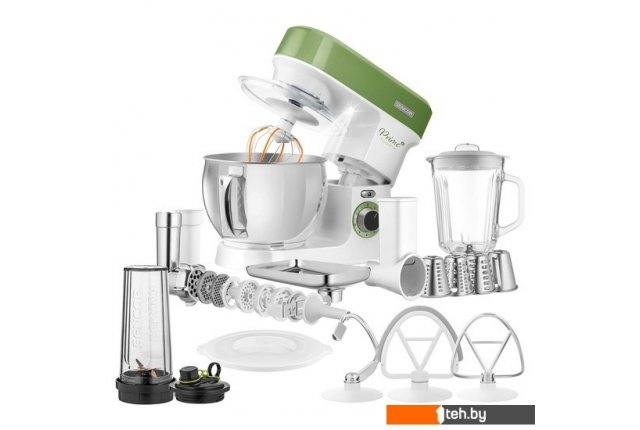 | Полная комплектация | Стеклянная чаша блендера 1,5л Чаша миксера 5л Две насадки для смешивания Насадка для теста Венчик Мясорубка с насадками для регулировки степени измельчения, набивки колбас, изготовления пасты и насадкой-шаблоном для формовки печенья Толкатель Овощерезка с 4 терками (мелкая терка, крупная терка, измельчение, нарезка ломтиками) Миксер для смузи 0,6л с крышкой для использования в качестве дорожной бутылки |