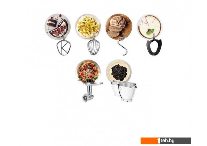 | Полная комплектация | К-образная насадка; крюк для теста; венчик; гибкий взбиватель; жаростойкая лопатка, 2 чаши (7 и 5 литров), насадка-мясорубка. |