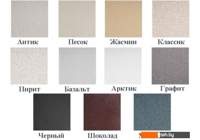 | Цвет | черный (антик, арктик, базальт, жасмин, малахит, классик, песок, пирит, графит, шоколад) |