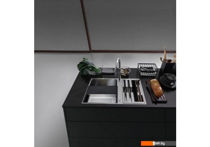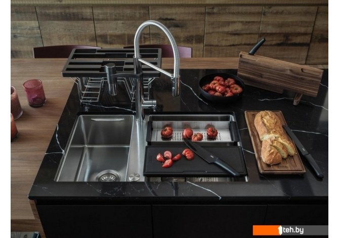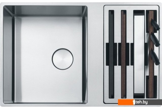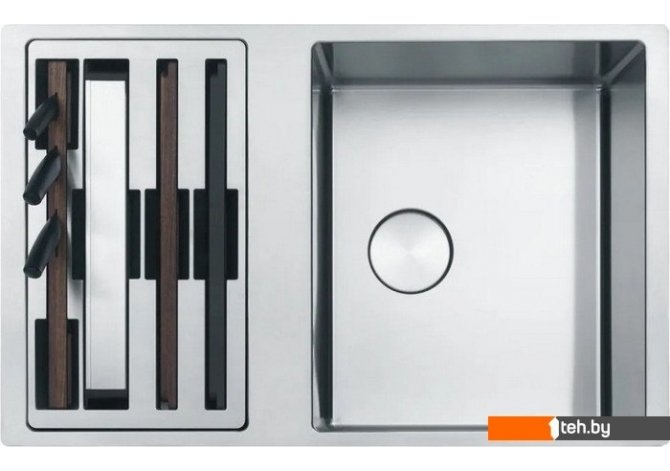 | Комплектация | сифон с вентилем-автоматом, кнопка из нержавеющей стали Easy Click. 2 разделочныедоски (полимерная и деревянная), миска из нержавеющей стали, три ножа (специальный нож для хлеба, овощей, мяса/рыбы), деревянный держатель для ножей. Размещение аксессуаров возможно на краях чаши. |