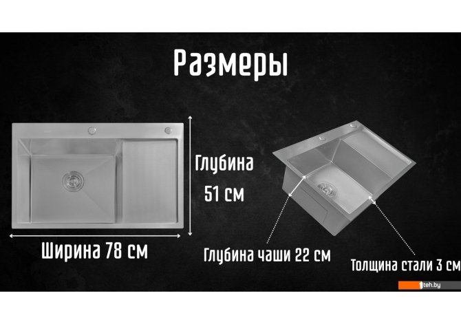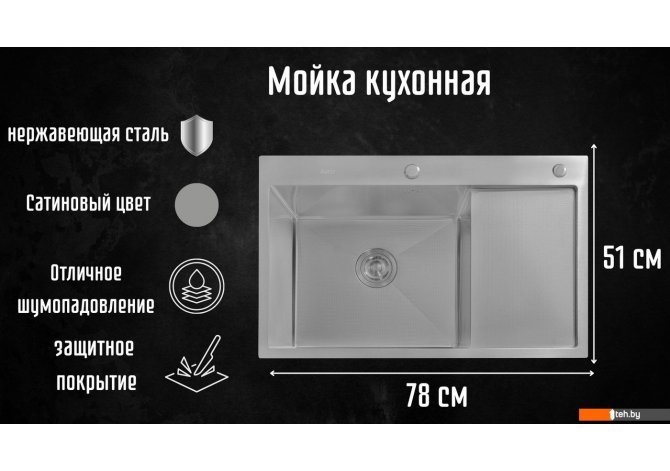 | Информация | -Ключевые характеристики Кухонная мойка выполнена из нержавеющей стали с PVD-покрытием, что обеспечивает долговечность и устойчивость к коррозии. Размеры мойки составляют 78 см в длину и 51 см в ширину, а глубина основной чаши достигает 22 см, что делает её удобной для мытья крупной посуды. -Преимущества и отличия Мойка имеет одно основное отделение и дополнительное крыло справа, что позволяет удобно раскладывать и сушить посуду. В комплект входят сифоны, коландер и дозатор для моющих средств, что делает её функциональной и практичной для использования на кухне. -Практичность Установка мойки осуществляется врезным способом на столешницу, что позволяет легко интегрировать её в любой кухонный интерьер. Наличие отверстия для смесителя упрощает процесс установки и использования. -Уникальность Мойка обладает уникальной микротекстурированной поверхностью, которая не только придаёт ей стильный вид, но и облегчает уход за ней, предотвращая накопление загрязнений. Читать дальше |