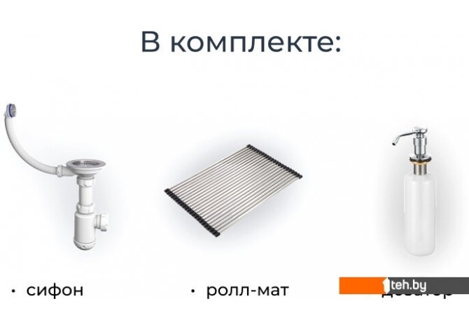 | Комплектация | Сифон, дозатор для жидкого мыла (нерж) и ролл-мат |