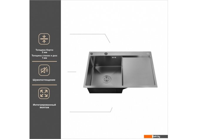 | Информация | - Современная, вместительная кухонная мойка с правым крылом из высококачественной пищевой нержавеющей стали обладает универсальным дизайном и будет эффектно смотреться на любой кухне. Кухонные мойки Handmade — мойки ручной работы. - На мойках предусмотрены отверстия под смеситель и дозатор для моющего средства. - Глубина мойки 18 см, что позволяет воде не разбрызгиваться из чаши. Толщина стали исключает деформацию. Дно мойки имеет угол наклона к сливу, что позволяет воде самостоятельно стекать. - Для звукоизоляции установлены шумопоглощающие накладки. Мойка обладает покрытием PVD и стильным цветом — темный графит. PVD покрытие обеспечивает эффективную и долговременную защиту от царапин и повреждений. - Мойка интегрированного типа установки: врезной монтаж и плоскостно-врезной способ. - Набор: мойка, дозатор врезной, сифон высокого качества с гофрой с универсальным выходом 40/50, заглушка для отверстий, корзинка для отходов при сливе.  |