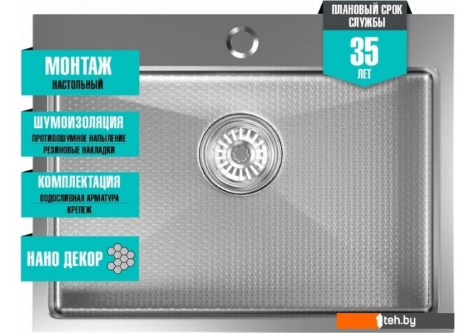| Информация | ? Мойка Mixline Pro НАНО имеет усиленное защитное PVD-покрытие с тиснением в виде сот, которое не отслаивается при ударах и механических воздействиях. ? Кухонная мойка Mixline Pro НАНО изготовлена сварным способом, что позволяет изготовить мойку с увеличенной глубиной чаши и более четкими гранями. ? Используется качественная нержавеющая сталь толщиной 3 мм, что обеспечивает защиту от деформации, повышенную прочность и устойчивость к окислению и повышенной температуре. ? Плоский кант придает аккуратный и эстетичный вид всей зоне мойки. ? Наличие шумоподавляющего покрытия, состоящего из резиновой накладки на дне и специального противошумного состава. ?? Кухонная мойка Mixline Pro НАНО является антибактериальной и не требует особого ухода. ? Легко удаляет любые загрязнения, капли воды и прочие жидкости не задерживаются на ее поверхности. |