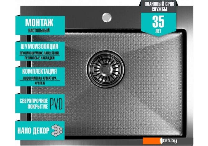 | Информация | ? Мойка Mixline Pro НАНО имеет усиленное защитное PVD-покрытие с тиснением в виде сот, которое не отслаивается при ударах и механических воздействиях. ? Кухонная мойка Mixline Pro НАНО изготовлена сварным способом, что позволяет изготовить мойку с увеличенной глубиной чаши и более четкими гранями. ? Используется качественная нержавеющая сталь толщиной 3 мм, что делает мойку защищенной от деформации, прочной, устойчивой к окислению и повышенной температуре. ? Плоский кант не выступает над поверхностью столешницы, что придает аккуратный и эстетичный вид всей зоне мойки. ? Наличие шумоподавляющего покрытия из резиновой накладки на дне и специального противошумного состава. ?? Кухонная мойка Mixline Pro НАНО является антибактериальной и не требует особого ухода - достаточно использования неагрессивного чистящего средства. |
