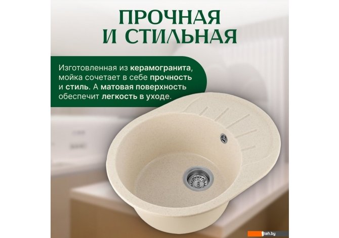 | Информация | - Мойка кухонная Pura — это идеальный элемент для вашей кухни, который создаст комфортную и практичную рабочую зону. Изготовленная из керамогранита, она сочетает прочность и стиль. Округлая или овальная форма в бежевом цвете с матовой поверхностью добавляет изысканности и гармонично вписывается в любой интерьер. |