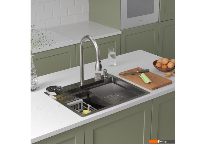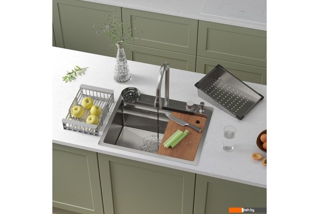 | Комплектация | ?Смеситель ?Ринзер (омыватель стаканов) ?Доска разделочня ?Сифон ?Дозатор для моющих средств ?Коландер телескопический ?Коландер ?Корзинчатый вентиль с декоративной накладкой ?Комплект креплений к столешнице |