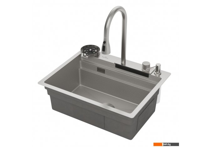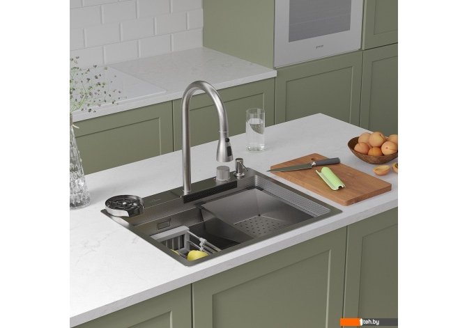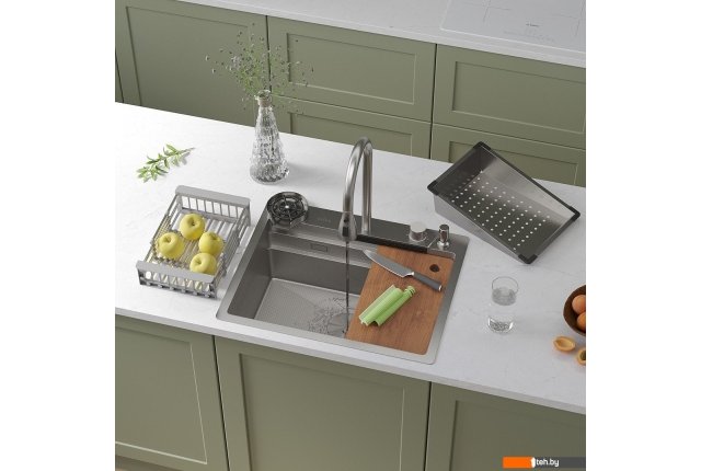 | Комплектация | ?Смеситель ?Ринзер (омыватель стаканов) ?Доска разделочня ?Сифон ?Дозатор для моющих средств ?Коландер телескопический ?Коландер ?Корзинчатый вентиль с декоративной накладкой ?Комплект креплений к столешнице |