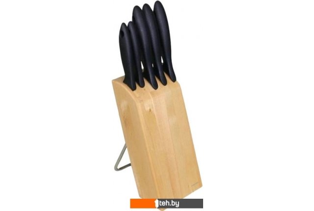 | Информация | Комплект состоит из ножа для чистки, ножа для корнеплодов, ножа для хлеба, кухонного ножа, ножа сантоку. Все ножи идут в деревянном блоке для ножей. |