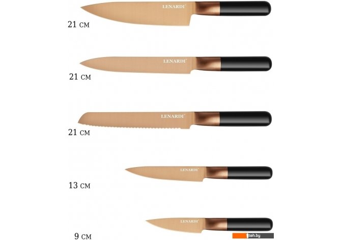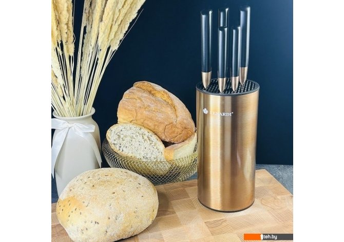 | Комплектация | - подставка, - нож для хлеба 21 см, - нож поварской 21 см, - нож для нарезки 21 см, - нож универсальный 13 см, - нож для овощей 9 см |