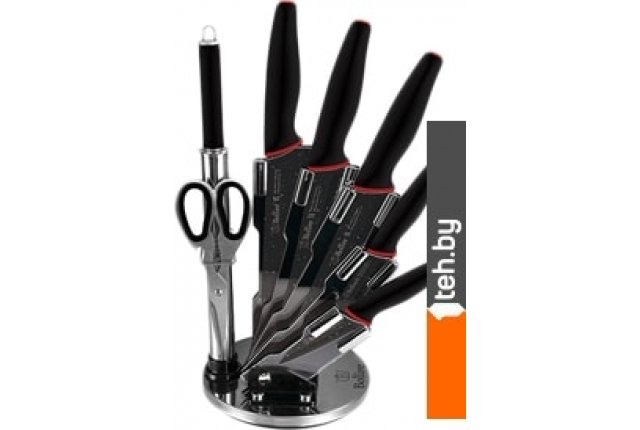 | Комплектация | - Нож для чистки овощей 9см, 1.2мм. - Нож универсальный 12.5см, 1.2мм. - Нож поварской 20см, 1.5мм. - Нож для хлеба 20см, 1.5мм. - Нож для нарезки 20см, 1.5мм.- Ножницы 20см, 15мм. - Точилка для ножей 19см. - Акриловая подставка для ножей. |