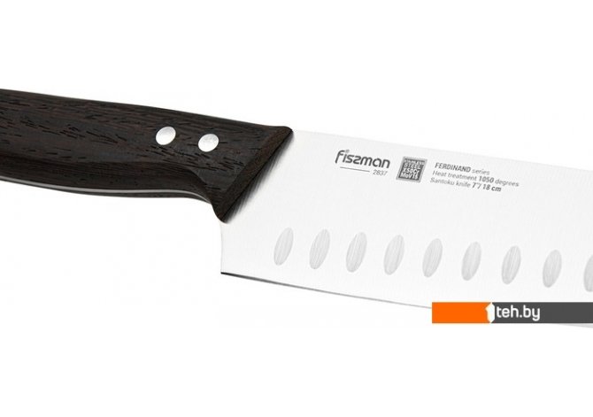 | Информация | ? Нож Сантоку - многофункциональное изделие, предназначенное для шинковки овощей, тонкой нарезки, разделки мяса и рыбы. Углубления на поверхности облегчают использование, в них при нарезке остается воздух, поэтому продукты не налипают на лезвие. Кухонные ножи серии Ferdinand выполнены из высоколегированной немецкой стали X50Cr15MoV, закаленной до 55 единиц по шкале Рокуэлла, обладают повышенной прочностью и подходят для частого использования. Лезвия имеют двухстороннюю симметричную заточку по всей длине режущей кромки, что обеспечивает легкую нарезку и разделку. Рукоятки из натурального африканского дерева Wenge имеют элегантную форму и обеспечивают надежный захват. Изготовленные по особой технологии они очень удобны и эргономичны, благодаря этой конструкции ножи безупречно сбалансированы и хорошо лежат в руке. |