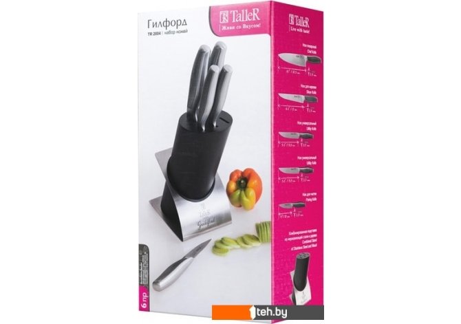 | Комплектация | - Нож поварской (лезвие 20,5см х 2,5мм) - 1- Нож для нарезки (лезвие 21см х 2,5мм) - 1- Нож универсальный (лезвие 13,5см х 2,0мм) - 2- Нож для чистки (лезвие 10см х 2,0мм) - 1- Подставка - 1 |