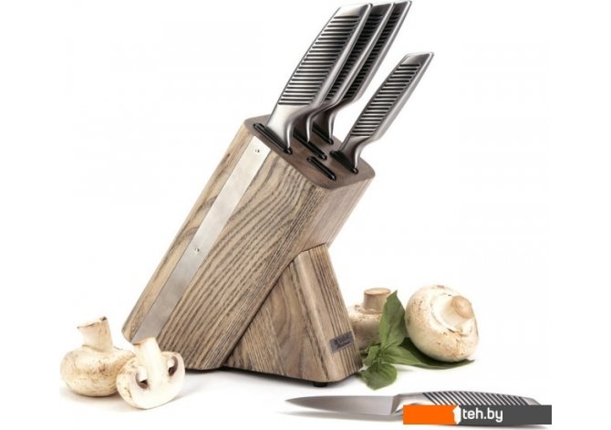 | Комплектация | - Нож поварской (лезвие 20 см х 2,5 мм) – 1 шт- Нож для нарезки (лезвие 20,5 см х 2,5 мм) – 1 шт- Нож для хлеба (лезвие 20,5 см х 2,5 мм) – 1 шт- Нож универсальный (лезвие 12 см х 1,8 мм) – 1 шт- Нож для чистки (лезвие 8 см х 1,8 мм) – 1 шт- Подставка из дерева ясеня |
