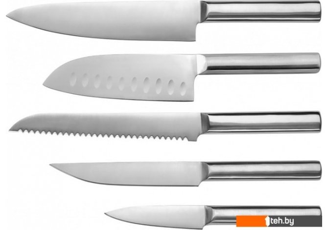 | Комплектация | - нож поварской – 1 шт, 20.0 см, 2.5 мм; - нож для хлеба – 1 шт, 20.0 см, 2.5 мм; - нож сантоку - 1 шт, 12,5 см, 2,0 мм; - нож универсальный – 1 шт, 12.5 см, 2.0 мм; - нож для чистки – 1 шт, 9.0 см, 2.0 мм; - подставка из каучукового дерева |