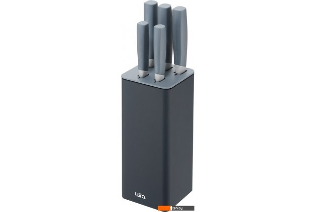 | Информация | Набор ножей LR05-71 – 5 в одном с дополнительной системой хранения. Благодаря подставке занимают мало места и стильно смотрятся на кухне. Ножи идеально сбалансированы, для защиты оснащены больстером между рукоятью и лезвием. Для большего удобства ручки ножей имеют покрытие SOFTtouch. Устойчивая подставка обеспечивает правильное хранение, благодаря чему ножи долго остаются острыми. В комплекте: подставка 98х220 мм с индивидуальными пластиковыми слотами для бережного хранения, шеф-нож, нож для нарезки хлеба, универсальный нож, нож для очистки, нож для нарезки. |