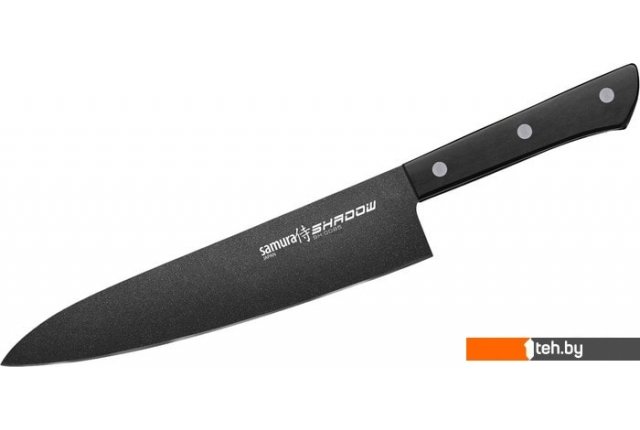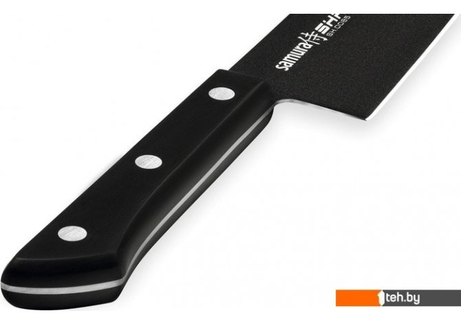 | Информация | Однослойный клинок из устойчивой к коррозии стали покрыт специальным составом, предотвращающим налипание на него продуктов во время работы. Выигрышное сочетание для Shadow – это AUS-8 Steel (материал лезвия) и Black anti-slip coating (силиконовое покрытие клинка). |