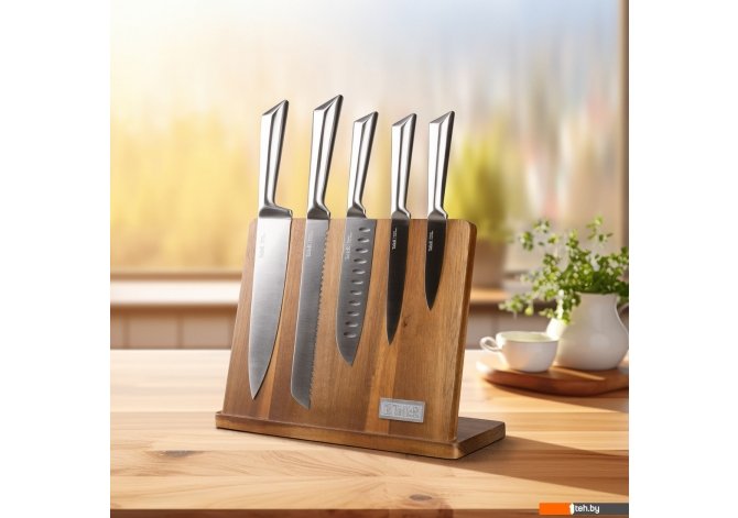 | Информация | - Лезвия ножей сделаны из коррозионностойкой стали AISI 420S45 (3Cr13). - Режущая кромка лезвия ножа устойчива к притуплению. - Рукоятки ножей выполнены из коррозионностойкой стали. - Ножи отлично сбалансированы и удобно ложатся в руку. - Подставка магнитная выполнена из дерева акации. - Магнит находится внутри подставки и отлично держит ножи. Состав набора (длина лезвия, толщина лезвия): нож поварской 20 см, 2,3 мм нож для хлеба 20 см, 2,3 мм нож сантоку 15 см, 1,6 мм нож универсальный 12,5 см, 1,6 мм нож для чистки 12,5 см, 1,6 мм подставка. - Рекомендуется ручная мойка. |