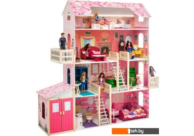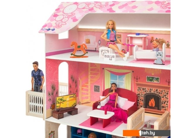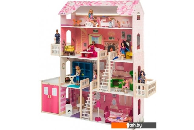 | Комплектация | - Кукольный дом- 28 игровых аксессуаров:Стиральная машинка (дверца открывается), унитаз (крышка поднимается) и раковина в бело-бежевой гамме в ванной комнате. 2 розовые кровати и торшер в спальне. Шкаф голубого оттенка, гладильная доска и утюг, напольные часы в гардеробной комнате. Мойка, плита, стол и 2 табурета на кухне, основной цвет - салатовый. Красный диван, журнальный столик, а также темно-коричневые телевизор и тумба под телевизор в гостиной. Желтый туалетный столик и пуф в будуаре. Белые люлька, пуф и комод в детской, а также игрушки – кукольный домик, лошадка-качалка, кошка и собака.- Фурнитура для сборки и заглушки для фурнитуры в цвет фасадов- Инструкция по сборке- Гарантийный сертификат. |