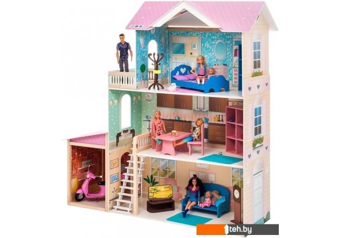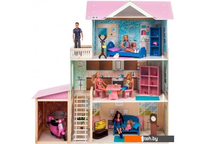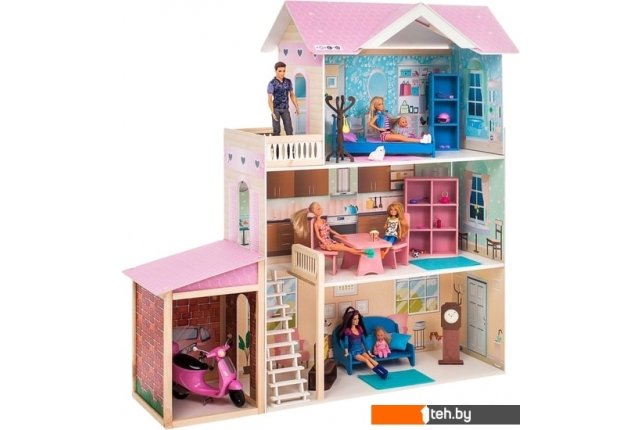 | Информация | Домик, выполнен в современном стиле, в нежно розовом цвете, благодаря которому домик кажется воздушным. Игрушку отличает нежный, пастельный принт по дереву внутри дома с акцентом на нежно голубой цвет, который отлично сочетается с девичьим розовым, не одна девочка не останется равнодушной к данному подарку. Домик предназначен для девочек старше трехлетнего возраста- Игрушечный дом для кукол "Розали Гранд" частично открытый (задняя стенка глухая, все игровые зоны с лицевой стороны полностью доступны для игры)- Разработан специально для кукол высотой до 30 см (так называемый, Барби-формат)В данной модификации дома – 1 лестница, 3 этажа, 3 комнаты, гараж и балкон. В комплекте: части домика, инструкция по сборке, мебель и аксессуары (всего 11 предметов): двухспальная кровать, шкаф (1 стойка открытая), вешалка, стол большой обеденный, 2 стула, шкаф (2 стойки открытые), диван, тумба под ТВ, телевизор, большие часы. |