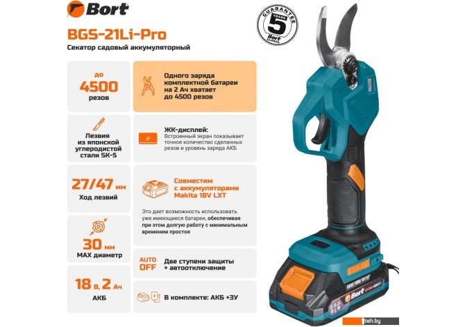 | Информация | Аккумуляторный секатор Bort BGS-21Li-Pro: Ваш сад в идеальном порядке без усилий Вы любите свой сад, но каждая сезонная обрезка превращается в испытание? Устали от боли в руках, мозолей и веток, которые не поддаются обычному секатору? Представляем Bort BGS-21Li-Pro — инструмент, который навсегда изменит ваше представление об уходе за садом. Забудьте о тяжелом труде и наслаждайтесь процессом, получая идеальный результат. Для кого и каких задач создан BGS-21Li-Pro? Этот секатор станет незаменимым помощником для: Дачников и садоводов-любителей: Легко приводите в порядок плодовые деревья, ягодные кусты и живую изгородь, тратя на это в разы меньше времени и сил. Владельцев виноградников: Выполняйте быструю и точную обрезку сотен лоз, не чувствуя усталости. Ценителей декоративных растений: Формируйте кроны кустарников и роз с хирургической точностью, обеспечивая здоровый рост и пышное цветение. Bort BGS-21Li-Pro решает главные проблемы садовода: Устраняет боль и усталость в руках: Мощный двигатель делает всю работу за вас. Справляется с толстыми ветками: Легко срезает ветви диаметром до 30 мм, которые не под силу механическим аналогам. Обеспечивает здоровье растений: Делает идеально чистый и гладкий срез, который быстро заживает и не травмирует растение. Почему вы полюбите работать с BGS-21Li-Pro? Мощь, которая не требует усилий Забудьте о напряжении в кистях. Сердце секатора — современный бесщеточный двигатель. Он не только обеспечивает легкий срез самых твердых веток, но и гарантирует долгий срок службы инструмента и экономный расход батареи. Вы получаете производительность, которая раньше была доступна только профессионалам. Интеллектуальный контроль над каждым срезом Это не просто секатор, а умный помощник с удобными фишками: ЖК-дисплей: Встроенный экран показывает точное количество сделанных резов. Контролируйте объем работы и оценивайте свою производительность! Два режима работы: Быстрый режим (раскрытие 27 мм): идеален для быстрой обрезки тонких веток и побегов. Мощный режим (раскрытие 47 мм): для уверенной работы с толстыми и старыми сучьями. Переключение между режимами происходит одним удержанием рычага — просто и интуитивно. Свобода от проводов и универсальность аккумулятора Секатор работает от универсальной аккумуляторной платформы 18V Li-Ion, которая полностью совместима с популярной системой Makita 18V LXT. Что это дает вам? Если у вас уже есть инструменты этой системы, вы можете использовать их аккумуляторы. Работайте без остановки: Одного заряда комплектной батареи на 2 Ач хватает до 4500 резов. Этого достаточно для обработки целого сада! Продуманная эргономика для долгой работы Мы знаем, что в саду важен каждый грамм. При весе всего 1,3 кг и идеальной балансировке секатор BGS-21Li-Pro ощущается как естественное продолжение руки. Эргономичная форма корпуса предотвращает усталость и позволяет работать часами с полным комфортом. Читать дальше |