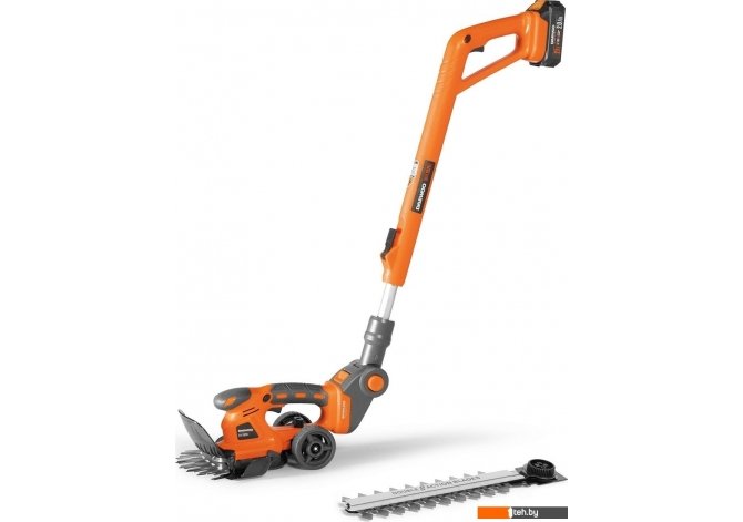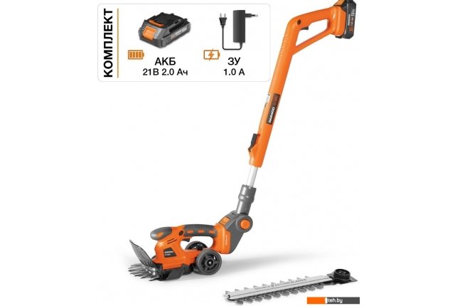 | Комплектация | - Ножницы-кусторез -1 шт. - Нож для кустарников -1 шт. - Нож для газона -1 шт. - Защитный щиток - 1 шт. - Ковш для травы - 1 шт. - Колеса для перемещения - 1 шт. - Рукоятка телескопическая - 1 шт. - Зарядное устройство -1 шт. - Аккумуляторная батарея 2,0 Ач - 1 шт. - Руководство по эксплуатации. - Коробка. |