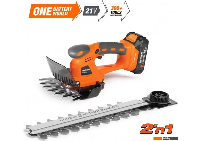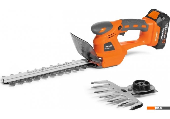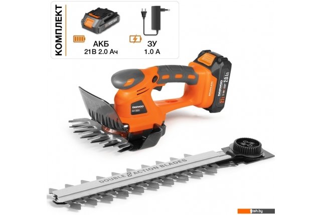 | Комплектация | - Ножницы-кусторез -1 шт. - Нож для кустарников -1 шт. - Нож для газона -1 шт. - Защитный щиток - 1 шт. - Ковш для травы - 1 шт. - Зарядное устройство -1 шт. - Аккумуляторная батарея 2,0 Ач - 1 шт. - Руководство по эксплуатации. - Коробка. |