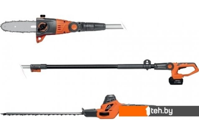 | Комплектация | - Кусторез - Защитный кожух ножей - Пила - Защитный кожух пилы - Телескопическая штанга - Наплечный ремень - Аккумулятор - Зарядное устройство - Руководство по эксплуатации |