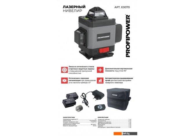 | Комплект поставки | - Лазерный нивелир; - Аккумулятор; - Зарядное устройство; - Коробка; - Дистанционный пульт; - Переходник; - Инструкция с гарантийным талоном. |