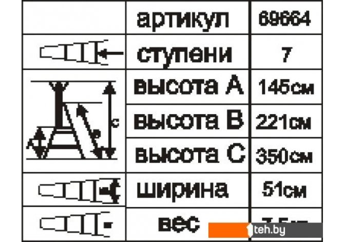Если хотите купить стремянка Энкор 69664 (7 ступеней) то следует уточнить все параметры и габариты модели перед покупкой. Представленые характеристики на сайте 1teh.by могут отличаться от действительных или указанных производителем. Описание, фото товара и технические характеристики представлены для справки.