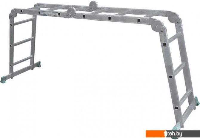 | Информация | Лестницы-трансформеры сделаны из соединенных вместе специальным шарниром секций (в основном это четырехсекционные лестницы). Такие шарнирные лестницы позволяют преобразиться из обычной приставной лестницы в П- или Л-образную конструкцию. |