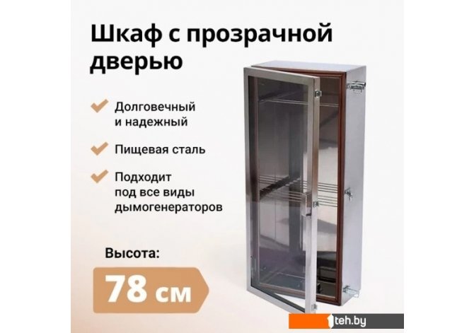 | Информация | Коптильный шкаф для холодного копчения рыбы, мяса, овощей, грибов, сыра и других продуктов. Шкаф изготовлен из пищевого металла — материал долговечен и не подвергается коррозии при правильном уходе. Герметичность обеспечивает контурное уплотнение, которое проклеивается в месте стыка дверцы и корпуса. Прозрачная дверца позволяет контролировать процесс визуально, а для отслеживания температуры на боковой стенке установлен точный электронный термометр. Также шкаф оборудован решетками, на которые можно укладывать копчености, либо подвешивать их вертикально. Совместим с дымогенератором «Hanhi 2», который необходим для подвода дыма в шкаф. |