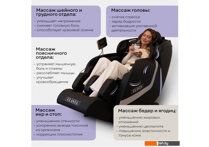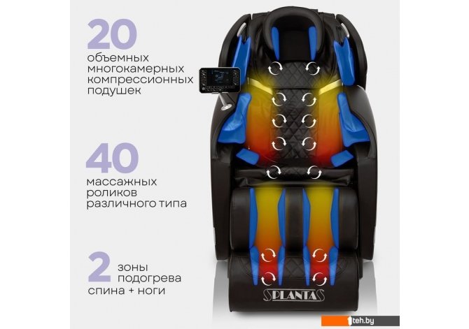 | Информация | - Массажное кресло Planta MC-3000B - идеальное решение для расслабления всего тела после тяжелого дня. - С помощью удобной панели управления с LED-дисплеем можно выбрать программу массажа и настроить его под себя. - Массажер оснащен воздушно-компрессионным механизмом, 20 компрессионными подушками и 40 массажными роликами для эффективного массажа различных частей тела. - Функция регулировки угла наклона позволяет выбрать наиболее комфортное положение, а функция невесомости обеспечивает максимальное расслабление и проработку мышц. - Закрытая подножка обеспечивает качественный массаж стоп и лодыжек. - Массажер имеет функцию подогрева, 5 автопрограмм, 8 ручных режимов, 3 уровня скорости роликового массажа и 3 уровня интенсивности воздушно-компрессионного массажа. - Электрический массажер оснащен таймером времени, функцией Bluetooth и динамиками для полной релаксации во время массажа.  |