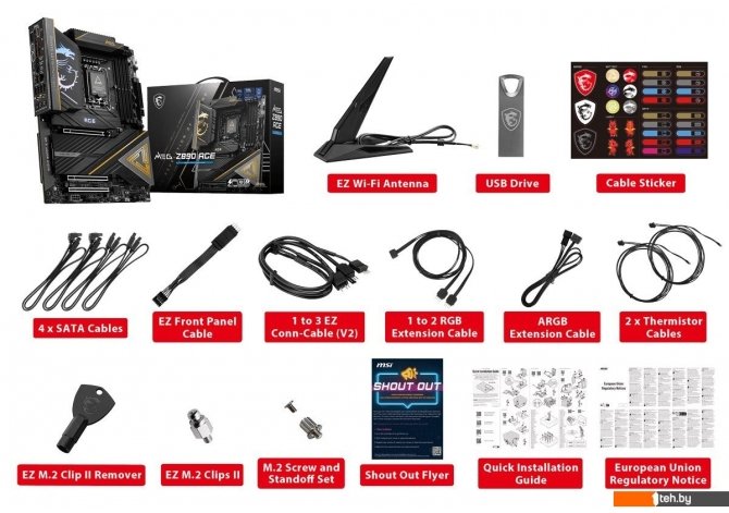 | Комплектация | - EZ Wi-Fi антенна - USB Flash накопитель - стикеры для кабелей - 4 кабеля SATA - EZ кабель фронтальной панели - 1EZ - 3EZ кабель - 1RGB - 2RGB кабель-удлинитель - ARGB кабель-удлинитель - 2 кабеля термистора - ключ-экстрактор EZ M.2 Clip II - монтажный комплект для M.2 - документация |