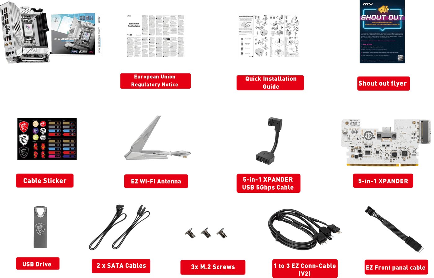 Комплектация | - EZ Wi-Fi антенна - USB Flash накопитель - стикеры для кабелей - 2 кабеля SATA - EZ кабель фронтальной панели - 1EZ - 3EZ кабель - винты для M.2 - карта расширения 5-in-1 XPANDER - кабель для карты расширения 5-in-1 XPANDER - документация |
