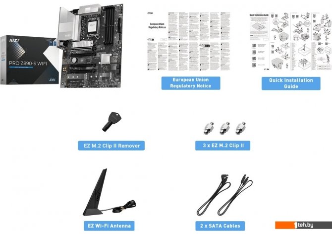 | Комплектация | - EZ Wi-Fi антенна - 2 кабеля SATA - ключ-экстрактор EZ M.2 Clip II - 3 винта со стойкой EZ M.2 Clip II - документация |