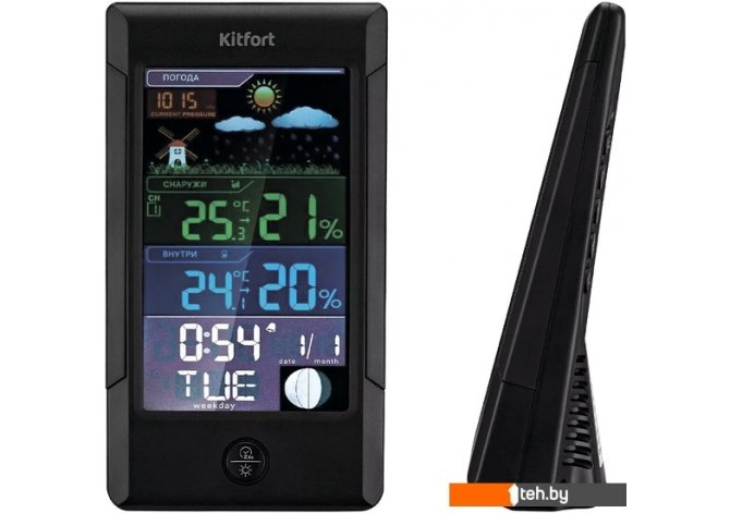 | Информация | Метеостанция KT-3322 позволит следить за показаниями t и влажности в помещении и на улице, фазой луны, погодой, атмосферным давлением. Устройство прогнозирует погодные условия на ближайшие 12–24 ч на основе изменения атмосферного давления. Также KT-3322 показывает время, дату, день недели и может служить будильником. Сигнал будильника можно отложить на 10 минут. Благодаря стильному дизайну и компактному размеру метеостанция легко впишется в ваш интерьер. У данного устройства цветной экран, на котором хорошо видны все необходимые значения. Подсветка имеет 3 уровня яркости. Данная модель оснащена одним датчиком, у которого есть отверстие для настенного крепления, чтобы получать показания температуры и влажности снаружи помещения. Питание датчика происходит от 2 щелочных батареек типа AAA (не входят в комплект). Кнопкой «Подсветка» происходит циклическое переключение яркости дисплея. Кнопкой «Настройка» осуществляется переход к настройке параметров. «Будильник» переходит к настройке будильника, включает и отключает будильник. Метеостанция может работать через USB-шнур или от 3 щелочных батареек типа AA (не входят в комплект), благодаря чему ее можно расположить в любом удобном для вас месте. Благодаря широкому основанию, метеостанция устойчиво стоит на столе. Устройство прогнозирует погодные условия на ближайшие 12–24 часа на основе изменения атмосферного давления. Прибор прогнозирует погоду в соответствии с изменением температуры и влажности. |