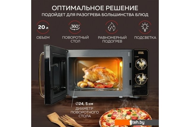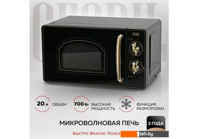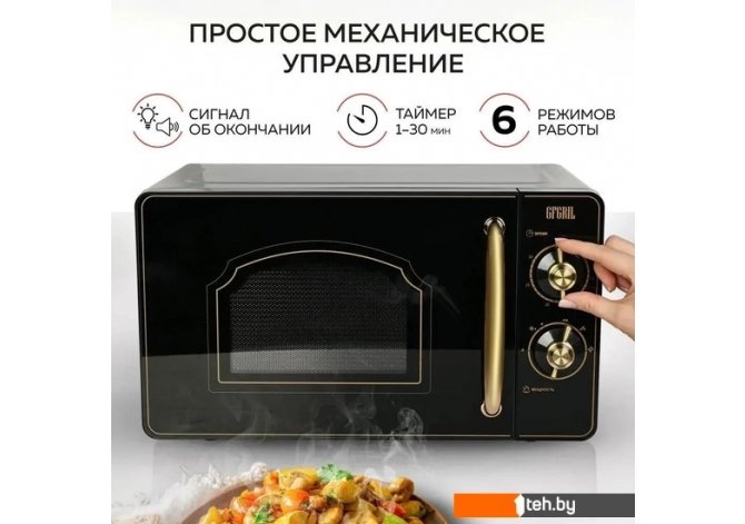 | Информация | ? Микроволновая печь GF-MWO202-black предназначена для быстрого приготовления, подогрева различных блюд и напитков, а также для размораживания продуктов. ? В отличие от классических печей (например, духовка или мини-печь), микроволновка генерируется тепло в самих продуктах и распространяет изнутри к внешней поверхности. ? Тепло не расходуется на нагрев воздуха, внутренних стенок печи и посуды, а нагревает только пищу. ? Так как волны проникают достаточно глубоко, почти во все пищевые продукты, это сокращает время разогрева и приготовления на 75%, экономит электроэнергию, а также позволяет сохранить максимум витаминов и полезных веществ. ? Микроволновка СВЧ выполнена в привлекательном дизайне и классическом черном цвете в ретро стиле «Рустик» и идеально впишется в интерьер любой кухни. ? Качественное исполнение и широкие функциональные возможности сделают эту модель украшением Вашей кухни. ? Изысканные бронзовые поворотные регуляторы, ручка дверцы и необычная форма смотрового окошка, расположенного на дверце, подчеркивают оригинальный внешний вид микроволновой печи. ? Благодаря оптимальному размеру (297*296*208 мм) и объему внутренней камеры 20 литров, а так же мощности 700 Вт и частоте микроволн 2450 МГц СВЧ печь позволит Вам быстро и равномерно разогреть Ваши любимые блюда или разморозить продукты. ? Печь микроволновая имеет эмалевое покрытие внутренней камеры, которое не впитывает запахи и устойчиво к появлению царапин, легко очищается от загрязнений, что продлевает срок службы микроволновой печи и облегчает уход и очистку. ? Вы можете выбрать один из 6 уровней мощности и установить время приготовления или разогрева от 1 до 30 минут при помощи механических поворотных регуляторов. ? Встроенная подсветка позволит наблюдать за процессом, не открывая часто дверцу. ?? По истечении установленного времени таймер оповестит Вас об окончании процесса приготовления звуковым сигналом. ? Микроволновка СВЧ имеет оптимальный размер (451*354*258 мм) и независимую конструкцию, что позволяет разместить ее в любом удобном месте на Вашей кухне. ? Микроволновая печь отдельностоящая GF-MWO202-black - это высокотехнологичное и стильное решение для любой кухни. |