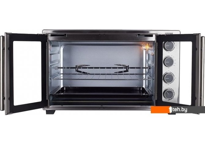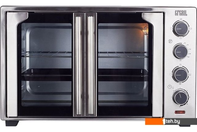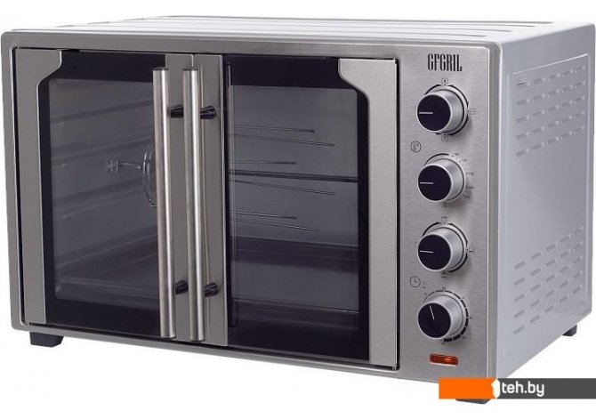 | Информация | Электрическая многофункциональная мини-печь GFGRIL GFO-90 имеет инновационный дизайн дверец «French door» - удобное открывание дверок одним касанием. Печь подойдет всем, кто не хочет тратить много времени на приготовление любимых блюд, но при этом хочет питаться вкусно и полезно. Электрическая мини-печь - это духовой шкаф и печь одновременно, которая дает возможность запечь или зажарить разнообразные блюда. Если у Вас уже есть плита или варочная панель, то печь с конвекцией составит к ним классическое дополнение. Благодаря вместительной внутренней камере объемом 60 литров мини-печь может стать полноценной альтернативой духовке и позволит приготовить объемные блюда, а также готовить на нескольких уровнях одновременно. Вы сможете приготовить различные блюда для всей семьи или для большой компании – курицу или рыбу целиком, большую пиццу, большие куски мяса, разнообразную выпечку. Два нагревательных элемента общей мощностью 2000 Вт обеспечивают быстрый нагрев от 100 до 250°С. Вы можете использовать нагревательные элементы в различных вариантах: Нагрев только сверху - работает только верхний нагревательный элемент. Используется для приготовления или придания готовому блюду аппетитной хрустящей корочки. Также подходит для разогрева небольших блюд. Нагрев только снизу - работает только нижний нагревательный элемент. Используется для блюд, требующих длительного и медленного пропекания. Так же подходит для финальной стадии приготовления, чтобы обеспечить наилучшее пропекание нижней части блюда. Верхний и Нижний нагрев - работают два нагревательных элемента. Используется для равномерного выпекания и жарки на одном уровне. Мини-печь электрическая снабжена функцией конвекции, а также вертелом, что позволит блюду равномерно приготовиться со всех сторон и обеспечит хрустящую корочку. Духовая печь GFGRIL GFO-90 имеет несколько режимов приготовления: Конвекция – благодаря встроенному вентилятору горячий воздух перемешивается, обеспечивая равномерное прогревание всего объема, что позволяет готовить пищу сразу на нескольких противнях. Вертел - благодаря вращению вертела достигается равномерное прожаривание мяса, рыбы или птицы. Вертел + конвекция - сочетание вертела и конвекционного вентилятора помогут при приготовлении объёмных блюд. Вы можете с легкостью выбрать один из 6 режимов приготовления, установить температуру от 100 до 250°С и время приготовления от 5 до 60 минут при помощи механических поворотных регуляторов. Встроенная подсветка позволит наблюдать за процессом, не открывая дверцу шкафа, что сохранит температуру внутри. По истечении установленного времени таймер оповестит Вас об окончании процесса приготовления звуковым сигналом. Электрическая печь с конвекцией поставляется в комплекте с решеткой, большим противнем, вертелом, шашлычницей, держателем для вертела, а также держателем с зажимом для безопасного и лёгкого извлечения противня/решетки из печи. Духовка электрическая для кухни с внутренним покрытием из оцинкованной стали не впитывает остатки пищи, по окончании приготовления их можно просто стереть салфеткой или губкой, что обеспечит простой уход и очистку электрической мини-печи. Печь электрическая с конвекцией оснащена дверцами из закаленного стекла, которые исключают вероятность получения ожогов и 