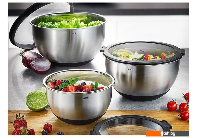 | Информация | - Универсальная миска с крышкой изготовлена из нержавеющей стали - матовой снаружи и глянцевой внутри. - На внутреннюю поверхность нанесена мерная шкала - до 4,5 л. - Герметичная прозрачная крышка окантована силиконом. - Дно миски покрыто силиконом для устойчивости на столе. |