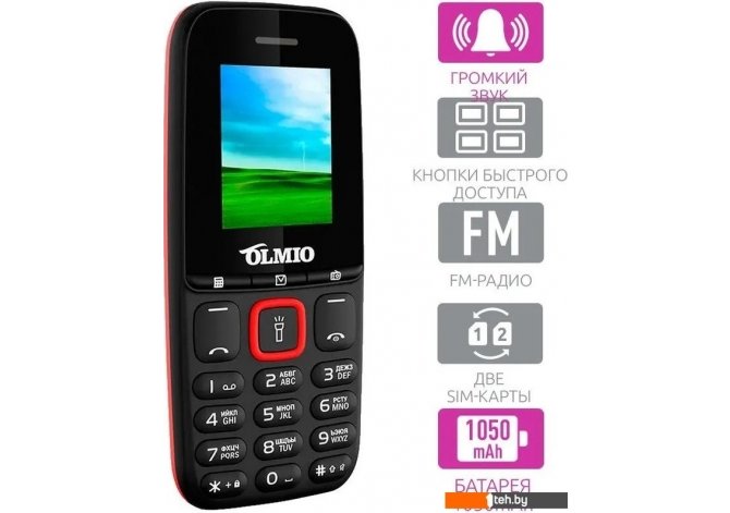 | Информация | - Olmio A15 - доступный кнопочный телефон с полным набором функций: звонки, сообщения, Bluetooth, будильник, секундомер, диктофон, календарь и калькулятор. - Устройство оснащено выделенными кнопками на лицевой панели для быстрого доступа к калькулятору, радио и FM-радио. |