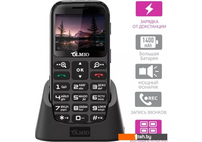 | Информация | ? OLMIO C37 - многофункциональный и удобный кнопочный мобильный телефон для пожилых людей. ? Простой интерфейс, четкие обозначения на клавишах, большой аккумулятор, фонарик, SOS-кнопка, функция лупы и многое другое. ?? Функция лупы позволяет читать мелкий шрифт без очков. ? Корпус из не скользящего пластика с мягкими линиями делает устройство практичным и привлекательным, а гладкие скругленные края дисплея придают ему утонченный вид. ? Голосовое сопровождение нажатых клавиш упрощает использование телефона людям с ограниченными возможностями зрения. ? Подставка для зарядки облегчает процесс зарядки телефона. ? Также присутствуют функции записи звонков, яркого фонарика, фото/видеокамеры. |
