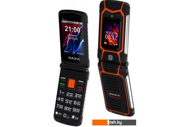 | Информация | Maxvi E10 - брутальный телефон в форм-факторе раскладушка с дополнительным внешним дисплеем, на котором отображаются время и уведомления. Аппарат имеет средний уровень защиты от воздействия воды и пыли. Maxvi E10 - функциональный телефон с ёмким аккумулятором (2000 mAh) и громким динамиком. |
