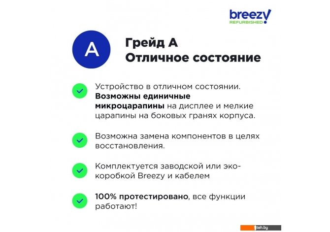 Информация | Смартфон восстановлен по программе Breezy. Класс восстановленного устройства A. Класс устройства говорит о состоянии смартфона после восстановления. К классу A относятся устройства, которые близки к новому состоянию. Возможны единичные микроцарапины. Возможны мелкие царапины на боковых гранях. Зарядное устройство отсутствует в комплектации с осени 2020 года. |