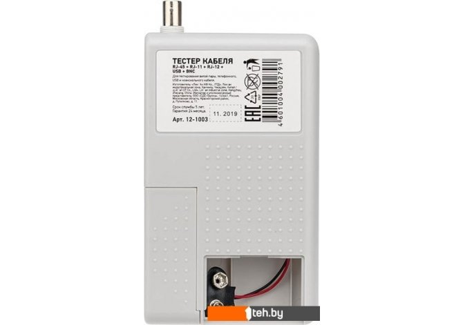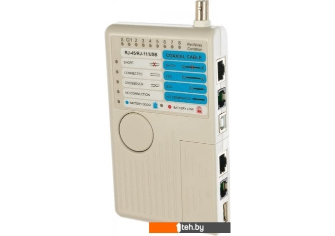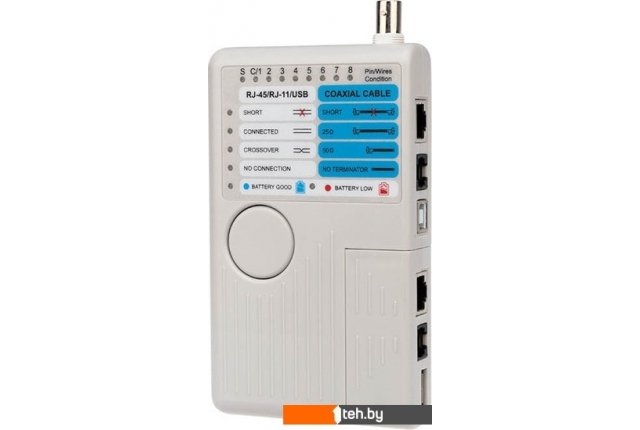 | Информация | Тестер кабеля универсальный для тестирования витой пары, телефонного, USB и коаксиального кабелей. Тестер состоит из двух функциональных блоков — из активной и пассивной части (заглушки), которые подключаются к концам кабельной линии через разъемы RJ-45, RJ-12, 1394, USB и BNC.Прибор имеет встроенный BNC терминатор 25/50 Ом. Результаты теста выводятся на информативную LED панель, на которой также есть индикация зарядки батареи питания.Корпус изготовлен из ударопрочной пластмассы и имеет красивый практичный дизайн. |