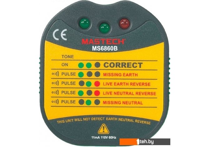 | Информация | Проверка разводки розеток 220В.Прибор для определения правильности подведения кабеля к евророзетке. Тестер позволяет определить перепутанные контакты "фаза" - "ноль", отсутствующий "ноль", отсутствующую "землю", перепутанные контакты "фаза" - "земля". |