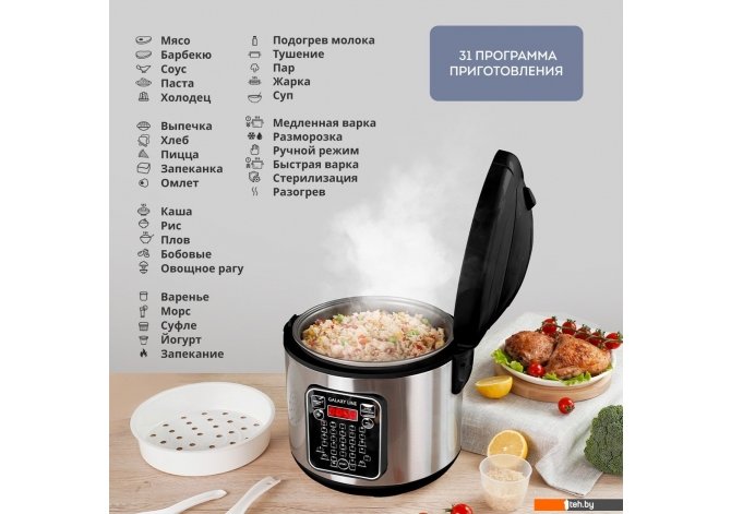 | Информация | - Мультиварка Galaxy Line GL 2646 - незаменимый помощник на вашей кухне. - 31 программа приготовления для самых разнообразных и вкусных блюд. - Рассыпчатый плов, сочное мясо, нежнейшее суфле и многое другое - выполните любые кулинарные идеи! - 5-литровая чаша с антипригарным покрытием, не влияющим на запах еды и не боящимся пригорания. - Помогает приготовить завтрак, обед и ужин для всей семьи! - Готовьте быстро, легко и со вкусом вместе с Galaxy Line GL 2646! |